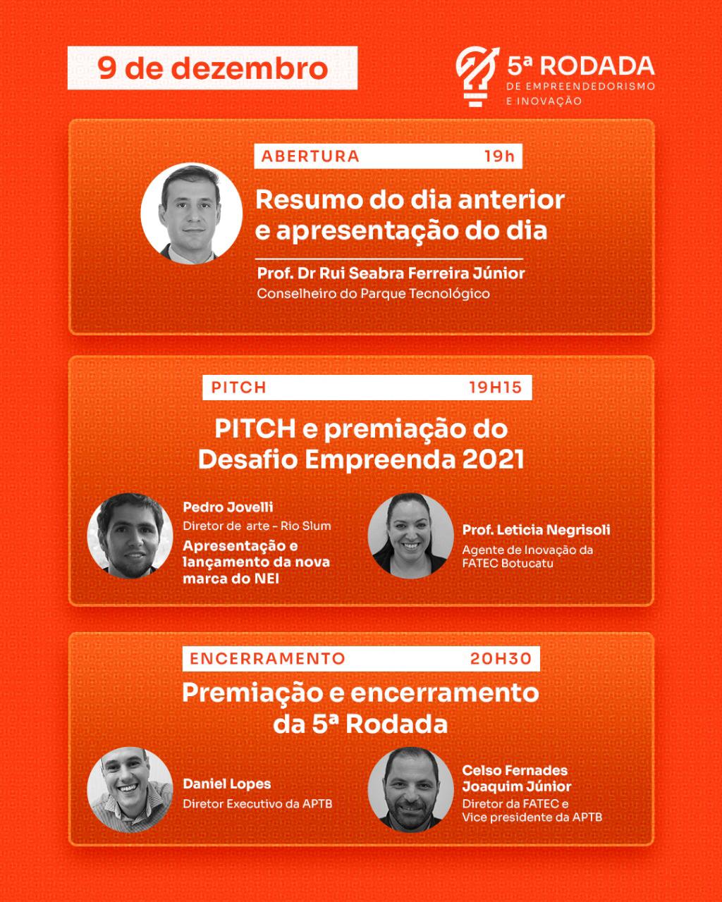 – No último dia de apresentações, serão realizados os Pitchs, a premiação do VI Desafio Empreenda Botucatu 2021 e encerramento da 5ª Rodada de Empreendedorismo e Inovação.